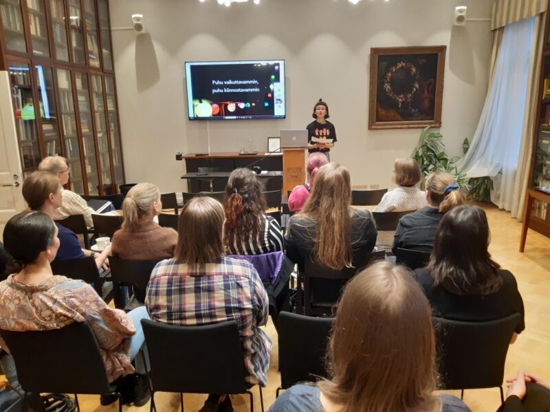 Kaisa Osolan pitämä koulutus tarjosi tutkijoille eväitä puheenvuoron rakentamiseen, esitystilanteeseen valmistautumiseen ja siitä suoriutumiseen.